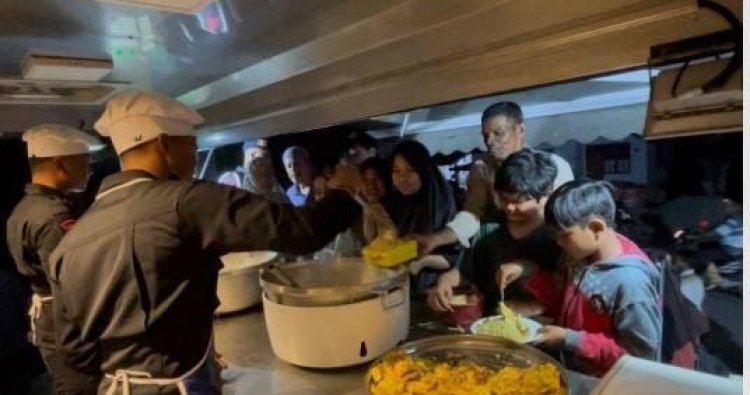 Sejak dibuka, mobil dapur lapangan tersebut langsung diserbu warga. Anak-anak, orang dewasa hingga lanjut usia tampak mengantre dengan tertib sambil membawa piring dan tempat makan. Mereka menerima paket nasi hangat lengkap dengan lauk mi instan dan telur, yang disajikan langsung dari Mobil Dapur Lapangan Brimob.