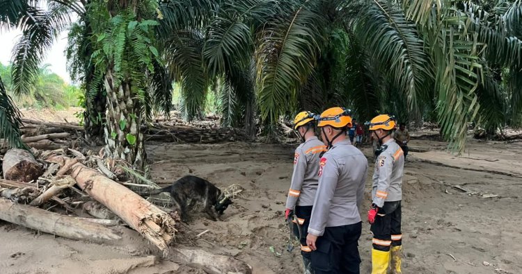 Batang Toru – Detasemen K9 Unit SAR Direktorat Polisi Satwa (Ditpolsatwa) Korps Sabhara Badan Pemelihara Keamanan (Baharkam) Polri memberikan perbantuan dalam operasi pencarian korban bencana alam di wilayah hukum Kepolisian Daerah (Polda) Sumatera Utara.