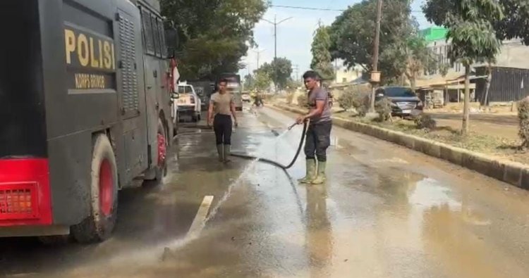 Menyikapi kondisi tersebut, Polri melaksanakan pembersihan serta penyiraman jalan protokol di Kabupaten Aceh Tamiang, Kamis (25/12/2025).