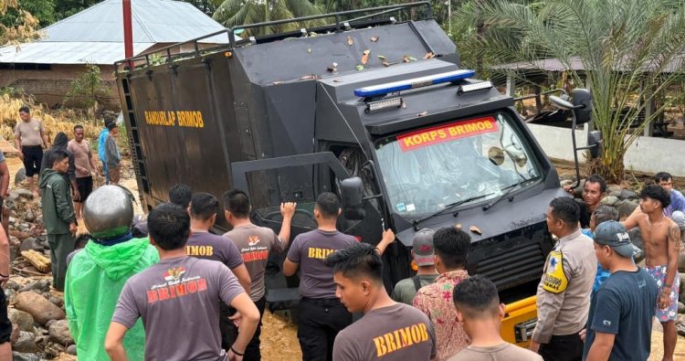 Personel Brimob Polda Sumatera Utara (Sumut) bersama relawan menunjukkan dedikasi luar biasa dalam mendistribusikan bantuan logistik bagi korban bencana.
