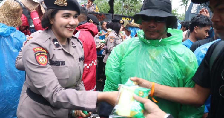 Di tengah hujan, Polwan bersama petugas kepolisian lainnya terlihat membagikan roti dan air mineral kepada para peserta unjuk rasa. Langkah tersebut menjadi wujud pelayanan humanis Polri kepada masyarakat yang tengah menyampaikan aspirasi secara terbuka.