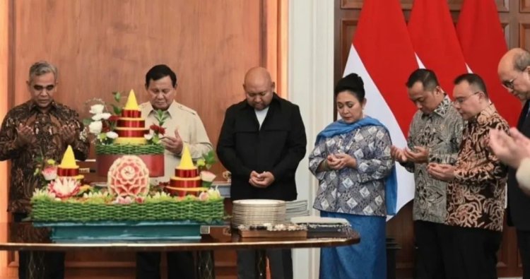 Detik-detik syukuran itu terekam jelas dalam unggahan tersebut. Presiden Prabowo terlihat khusyuk memimpin doa bersama para pejabat negara, mengelilingi tumpeng nasi kuning yang menjadi simbol perayaan tradisional. Setelah sesi doa, keceriaan berlanjut dengan obrolan santai antar tokoh bangsa.
